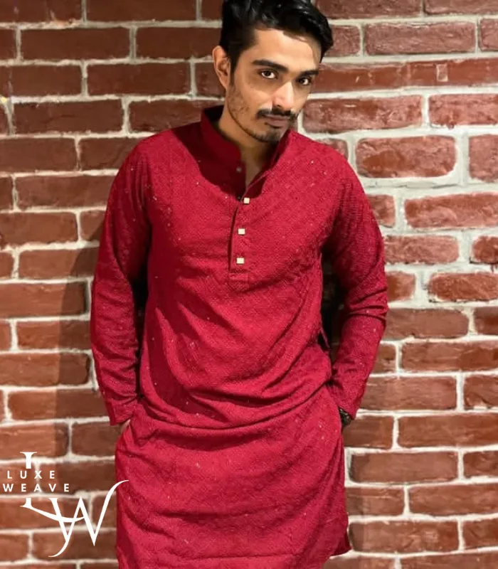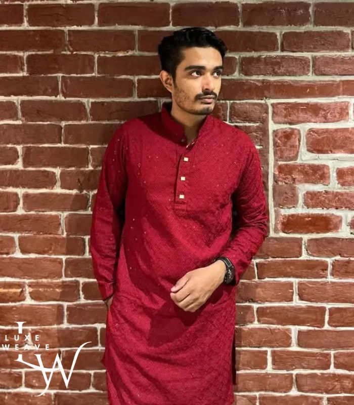 Step into timeless elegance with the Luxe Red Embellished Panjabi — a masterpiece designed for the modern gentleman. Crafted from premium fabric, this Panjabi features subtle all-over embellishments that add a refined touch of sophistication without overpowering the classic silhouette. The sleek button placket and structured collar elevate its traditional roots with a contemporary twist, making it perfect for festive occasions, formal gatherings, or cultural celebrations. Pair it with matching trousers or a stylish shawl to complete your standout look.