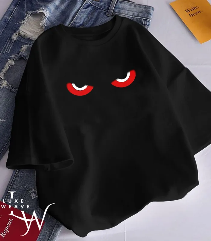 Crafted from premium cotton, this black oversized T-shirt features a striking red-and-white eye graphic that exudes confidence and mystery. The relaxed fit and soft fabric make it a go-to piece for casual streetwear or an effortlessly edgy outfit. Pair it with distressed denim or joggers for that unmistakable LuxeWeave aesthetic.